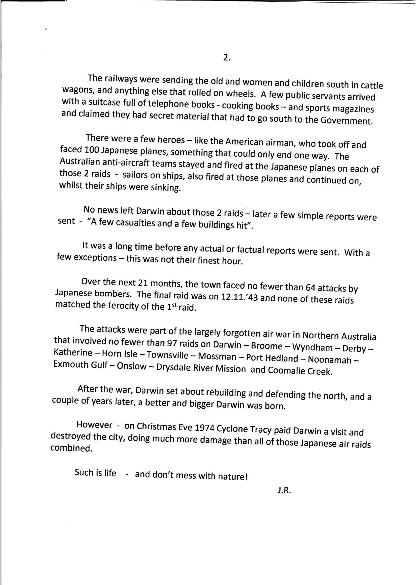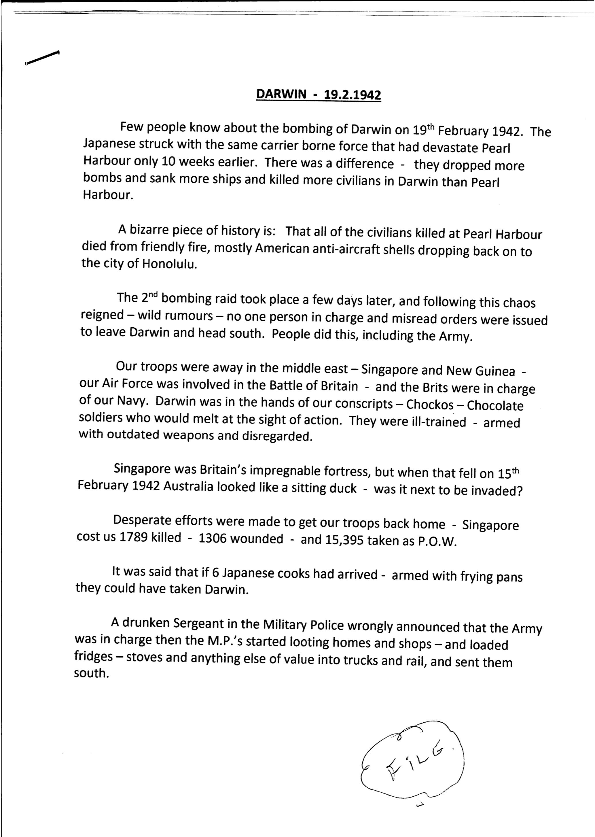 In addition to his writings on the Axis powers, Rose also sent me a tract about the Japanese air raids on Darwin. These caused extensive damage to the city and resulted in a massive proportion of its residents leaving; it is doing much better now.